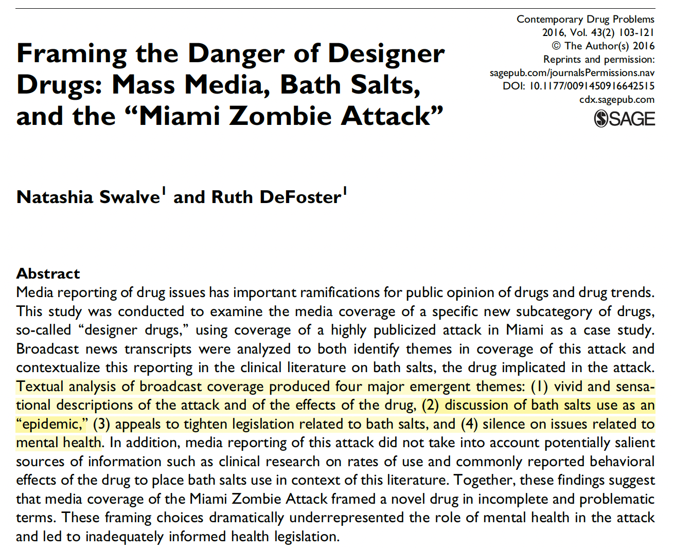 For this study, researchers analyzed transcripts of televised news coverage of a drug known as ‘‘bath salts’’ in response to a 2012 assault in Miami. A toxicology report concluded the perpetrator had not been under the influence of this drug. The analysis included reports by CNN, FOX, MSNBC, NBC, ABC, CBS, and NPR.