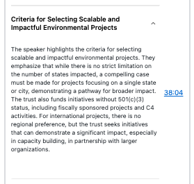 This approach proved particularly useful as it allowed me to quickly scan the content through the section titles and summaries. I could then use the timestamp function to directly access and watch the parts of the video that were most relevant to our needs.