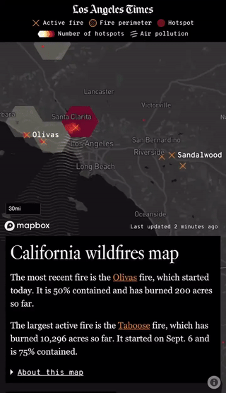 Quakebot coverage is pretty important for us as a paper and is a regular profit-driver as well. However, whether or not it converted more subscribers, we wanted to add features and increase our coverage since people were really interested in it. As for the Fire Map, we didn’t have automated fire coverage, so reporting always included a lot of scrambling. Our new Fire Map pools from about eight different data sources, and it not only populates the map but saves the data for other custom visualizations we can produce later. Features we’ve added to the automated tools have eliminated many hours for the graphics team, which was nice as well.